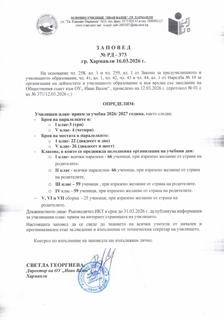 Математика – ИУЧ – 1 учебен час седмично; следобедни занимания – 2 учебни часа седмично.